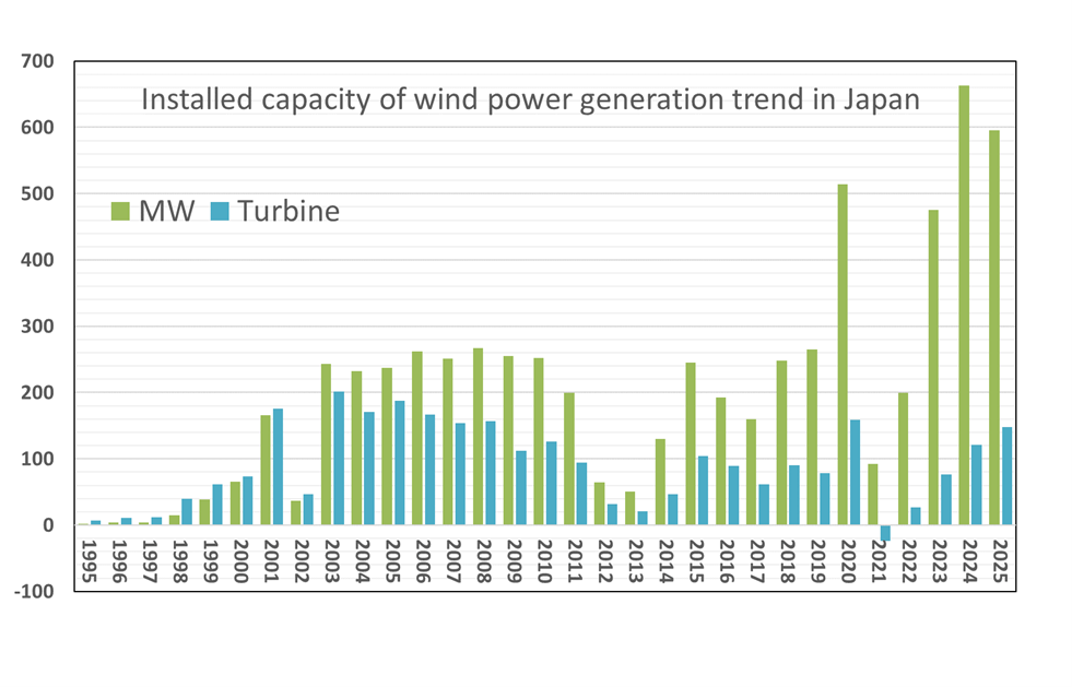In 2025, newly installed capacity (gross) totaled 625.0 MW (171 turbines) across 24 sites nationwide. After accounting for decommissioned sites, the net increase amounted to 595.5 MW (148 turbines) across 18 sites, bringing Japan’s cumulative installed wind power capacity to 6,434.2 MW (2,866 turbines).